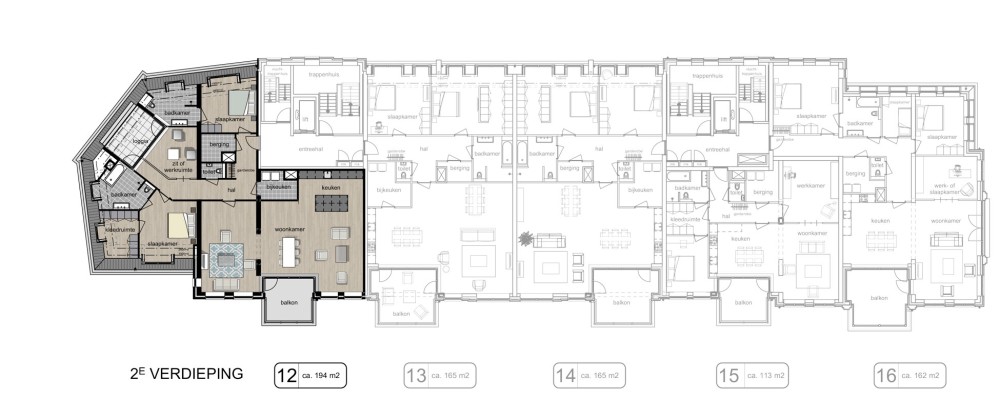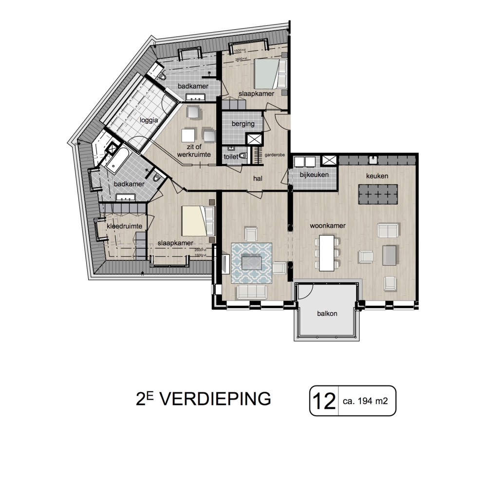 Dit zeer ruime appartement van ca. 194 m2 heeft een unieke indeling. Deze parel beschikt over twee slaapkamers met beiden een eigen badkamer en suite. Eén slaapkamer grenst tevens aan een ruime ‘walk-in-closet’. In de entreehal is een riante bergruimte en een separate bijkeuken gesitueerd. De royale living grenst aan de riante woonkeuken waar u de mogelijkheid heeft om een kookeiland te verwezenlijken. Een bijzonder detail is dat dit appartement niet alleen beschikt over een gezellig zonnig gelegen balkon, maar ook over een beschutte loggia waar u heerlijk kunt genieten van de ondergaande zon.